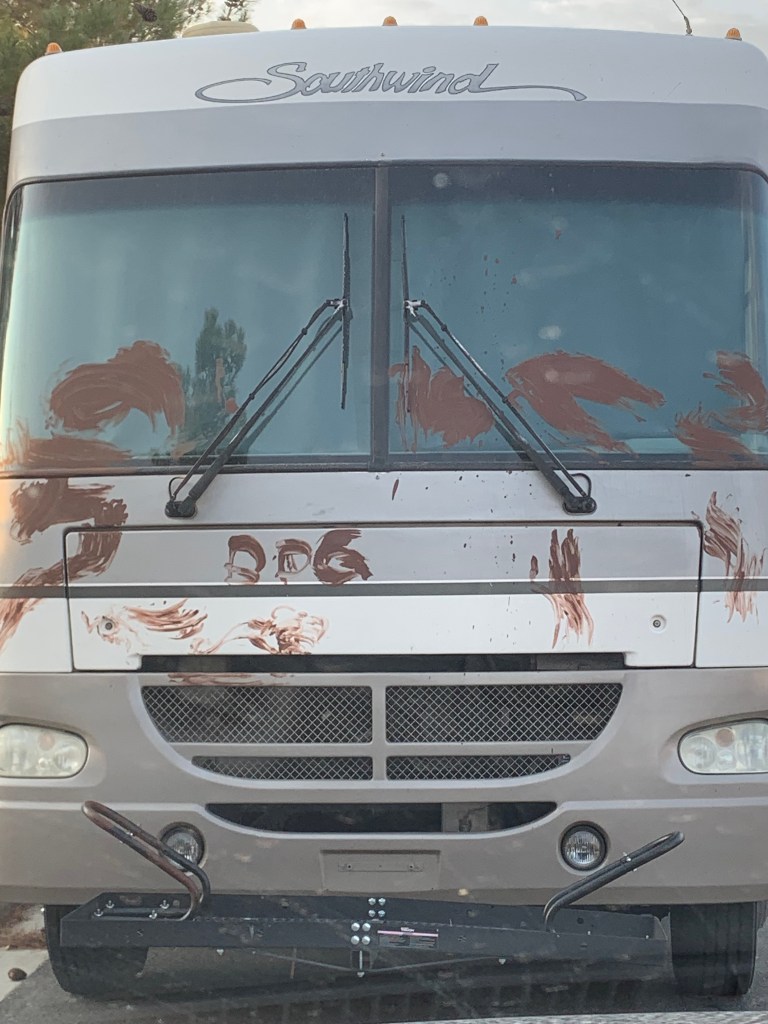 So… Tiny was vandalized this week. We park our motorhome on the street and this has always been a worry about doing so but the prices of storage are outrageous. So we opted to take our chances and it looks like our luck has been tested. Luckily it looks like kids spread mud or something all over the front but easily fixed with soap and water. Needless to say we will be moving it to another location tomorrow.